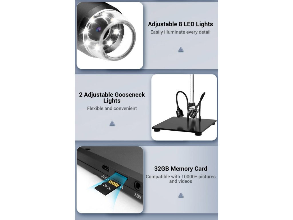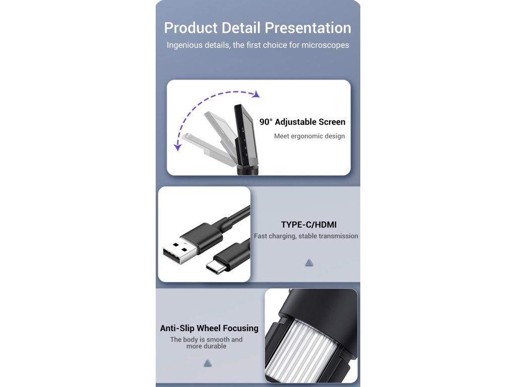 Flexibilní připojení Type-C a HDMI – umožňuje připojit mikroskop k počítači, televizoru nebo jinému externímu displeji pro větší zobrazení.